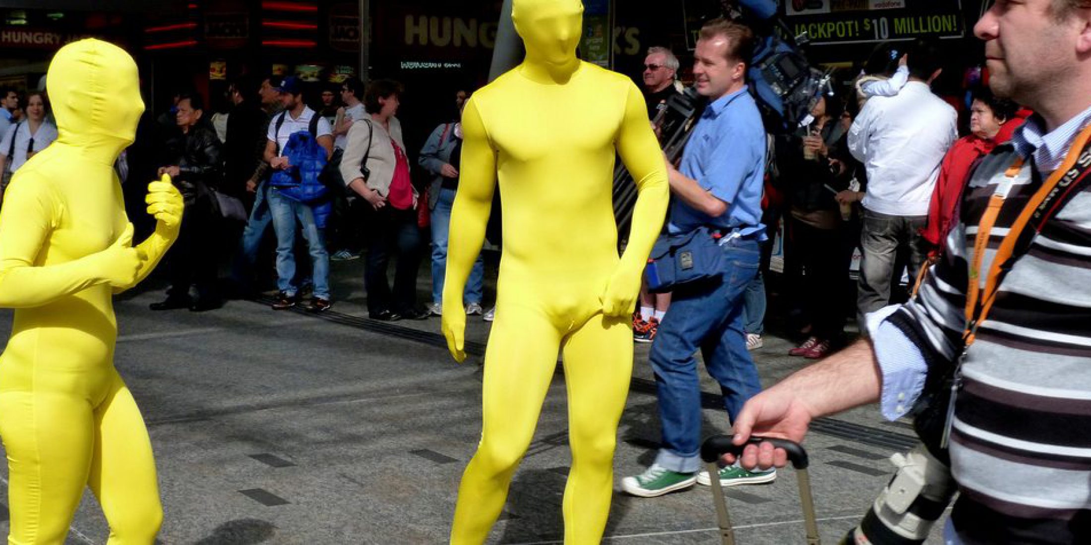 After completing a survey given to recent purchasers the results showed male customers weren’t particularly thrilled about how prominent wearing Morphsuits made their crotch. At the time, the homepage had a large hero image with four guys at a festival, all wearing Morphsuits, with one guy’s wang being particularly noticeable (shown below if you’re into that sort of thing). They ran two versions of the site alongside each other: one unchanged and another with the man’s schlong tastefully edited out. Half the visitors saw a banner free of dick and the other half saw the original image. I don’t recall the exact values, but the version without this dude’s pork sword on display achieved a significant increase in sales.